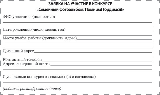 Конкурсная работа должна представлять серию семейных фотографий (не более 5 фото) военного и послевоенного времени с кратким творческим комментарием (рассказом) (объем не более двух страниц формата А-4 (до 3 600 знаков, с учетом пробелов) о людях и событиях, показанных в фотоматериалах.